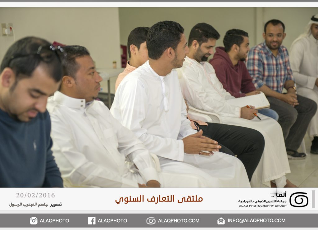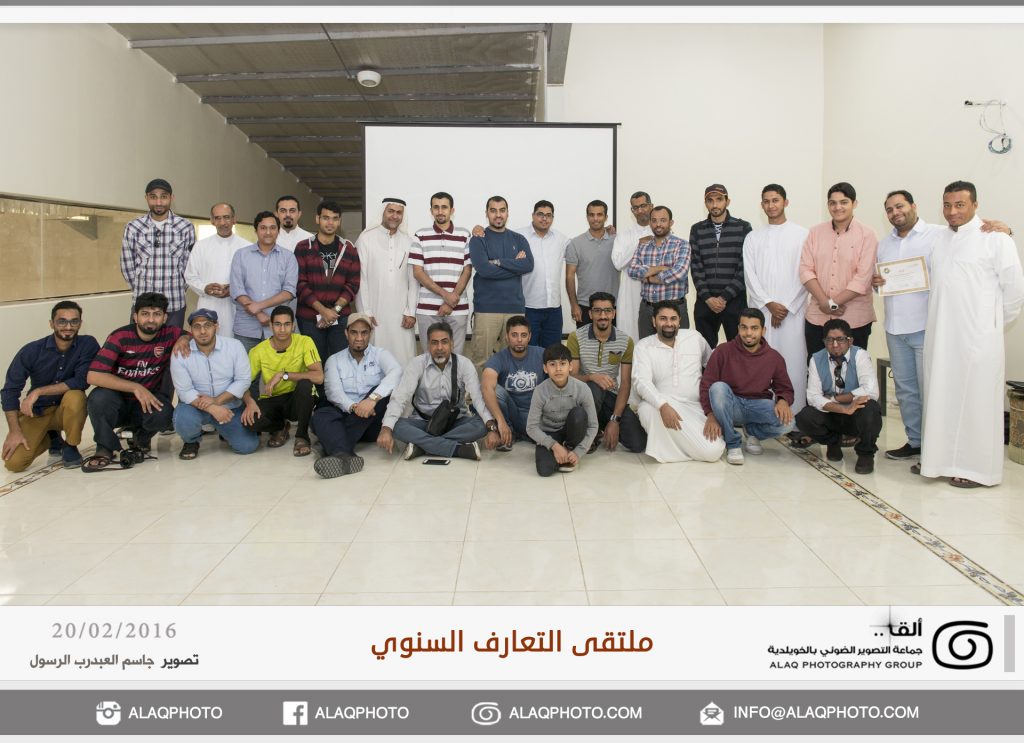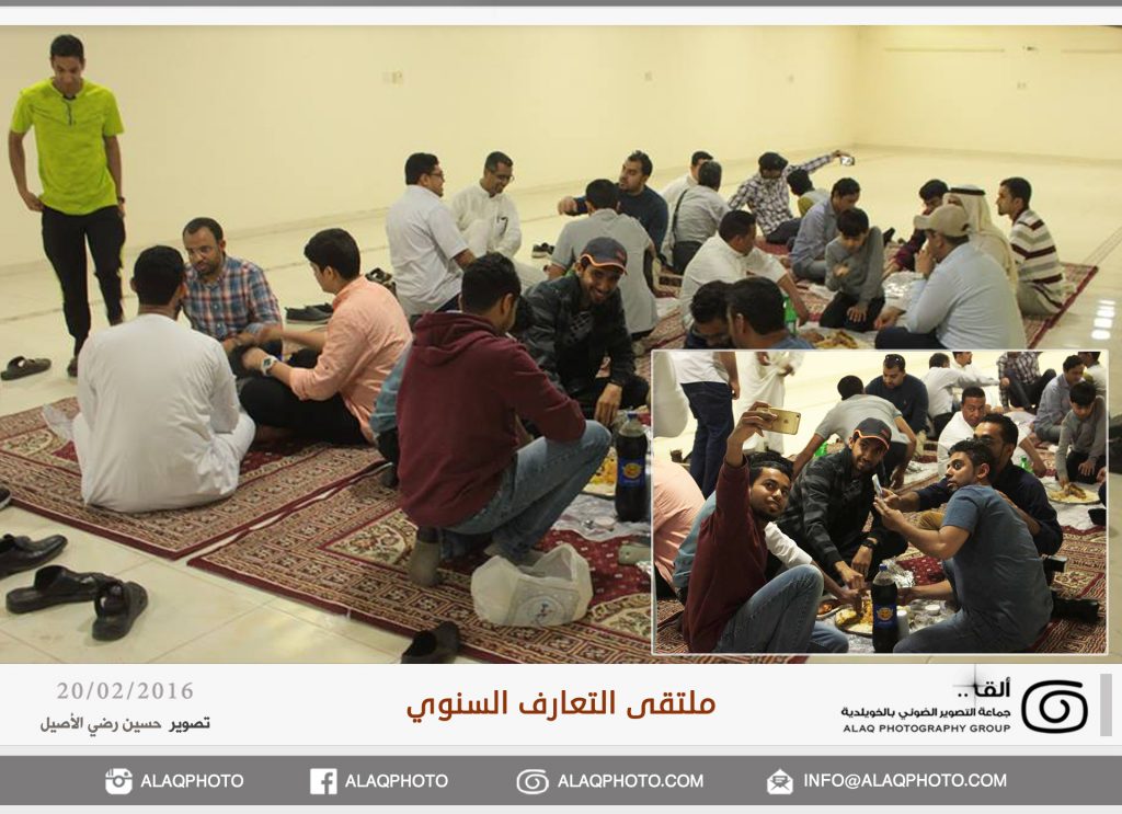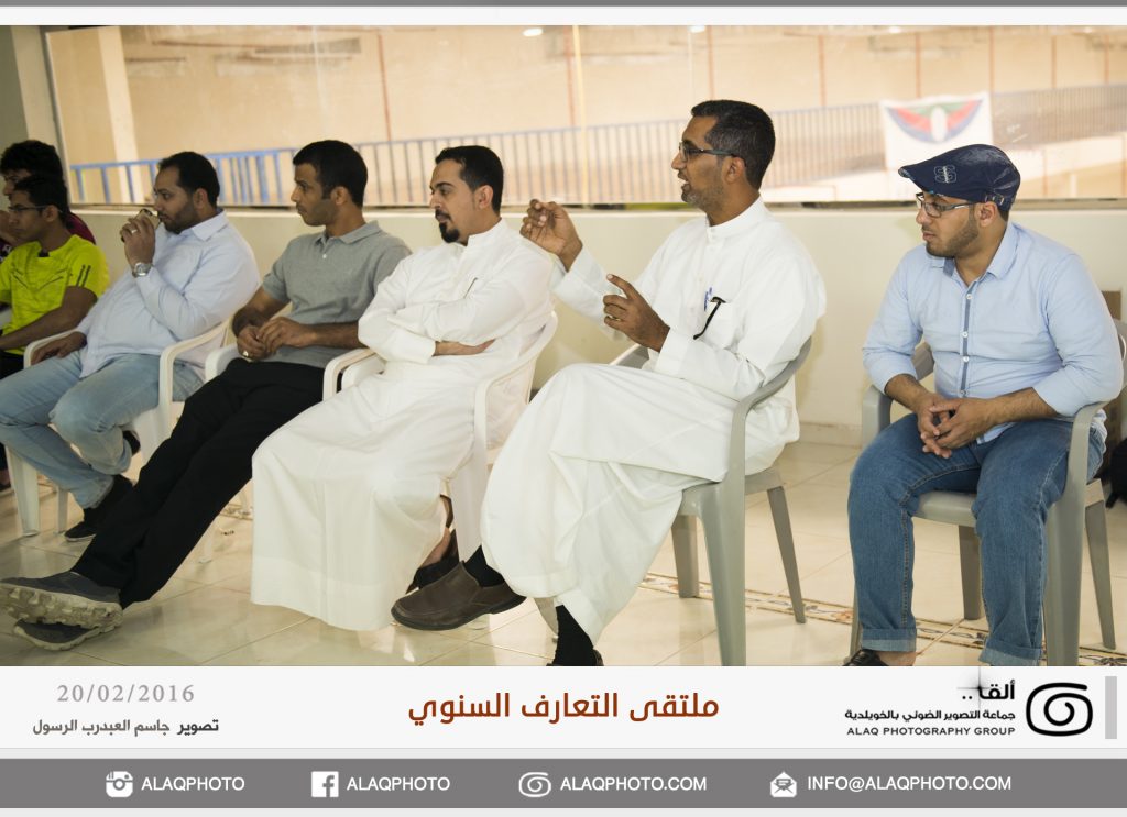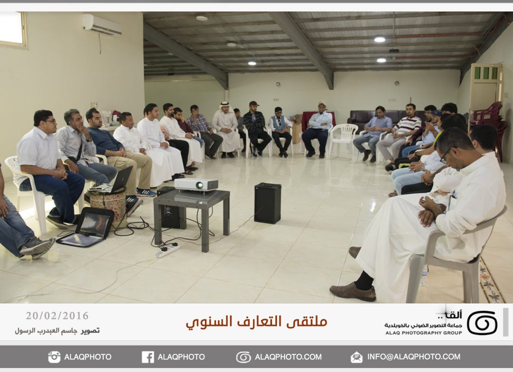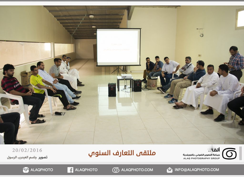 أقامت (ألق) جماعه التصوير الضوئي بالخويلدية ملتقى التعارف السنوي للأعضاء وذلك مساء يوم السبت الموافق 20 فبراير 2016 م في مقر الجماعة بالنادي والذي حضره حوالي ثلاثون عضواً من ألق . وابتدأ اللقاء بجولة تعريفية لكل عضو ، ليعرفعن نفسه واهتماماته بالتصوير الضوئي وكيف التحق بهذه الهواية .