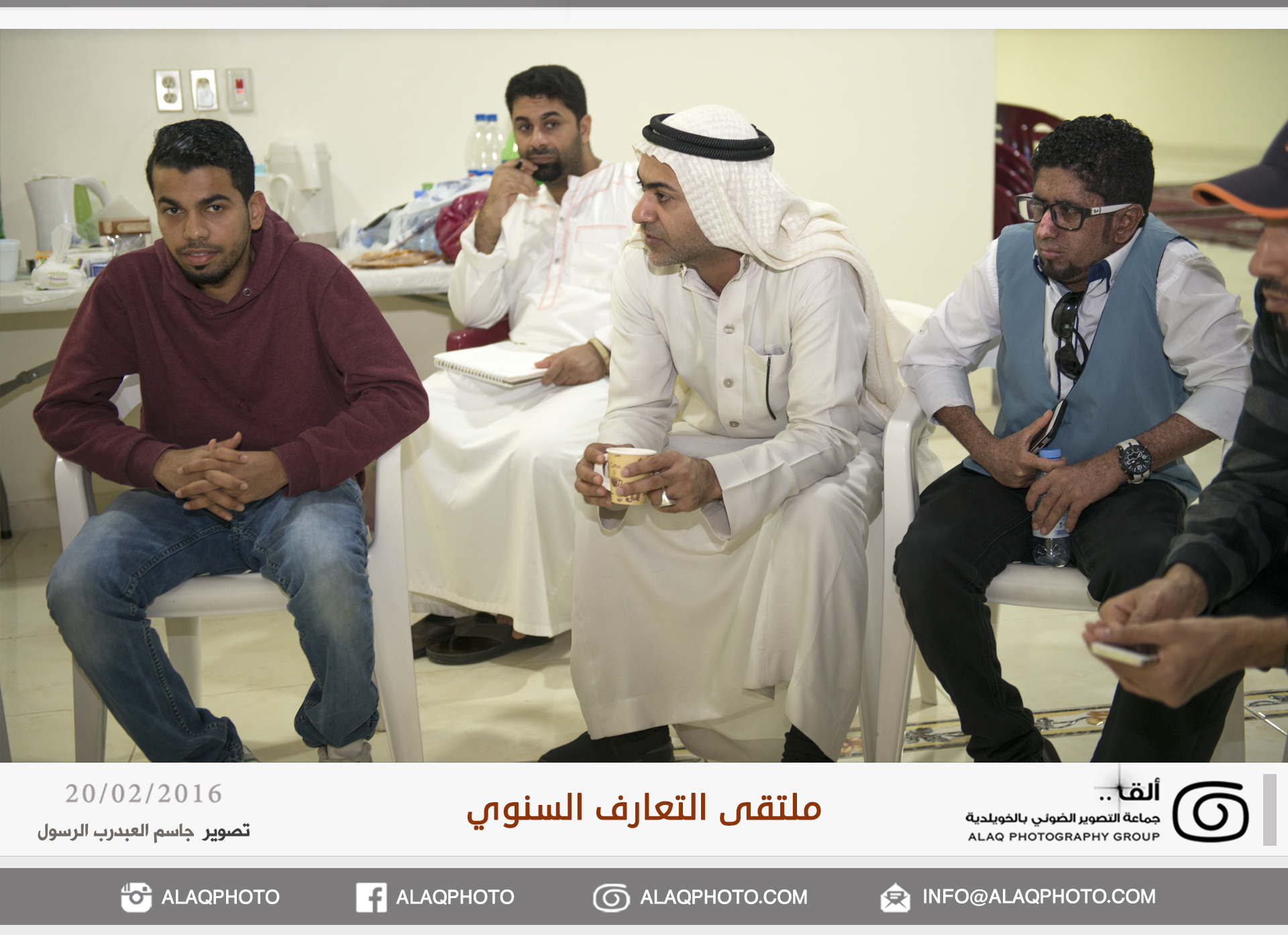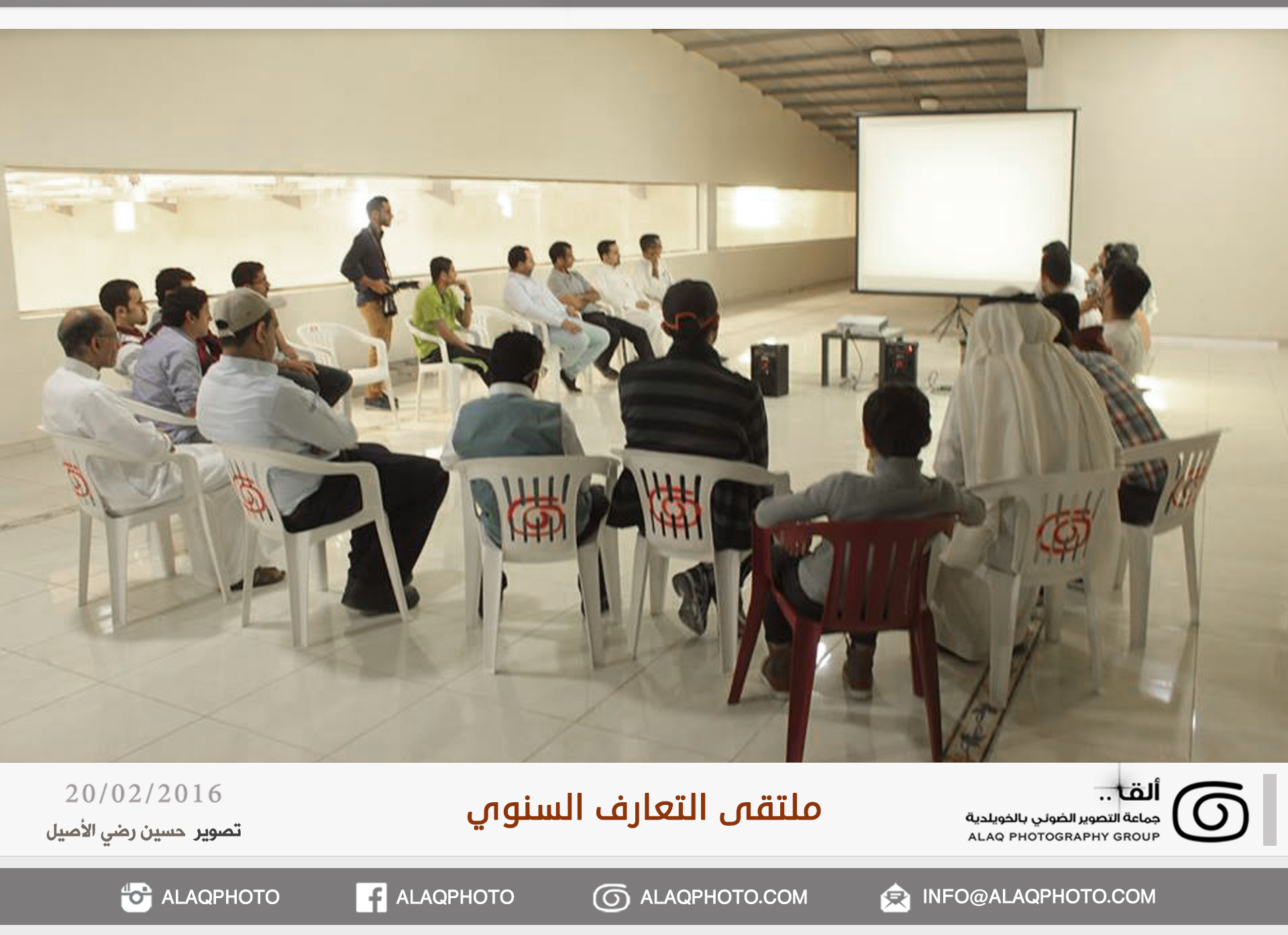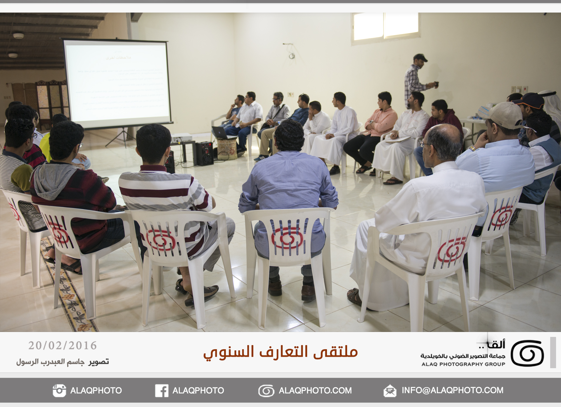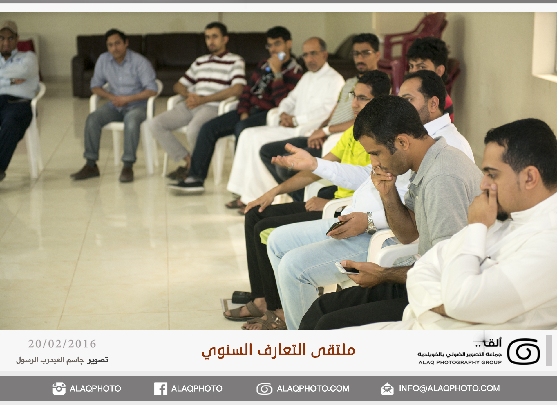 أقامت (ألق) جماعه التصوير الضوئي بالخويلدية ملتقى التعارف السنوي للأعضاء وذلك مساء يوم السبت الموافق 20 فبراير 2016 م في مقر الجماعة بالنادي والذي حضره حوالي ثلاثون عضواً من ألق . وابتدأ اللقاء بجولة تعريفية لكل عضو ، ليعرفعن نفسه واهتماماته بالتصوير الضوئي وكيف التحق بهذه الهواية .
