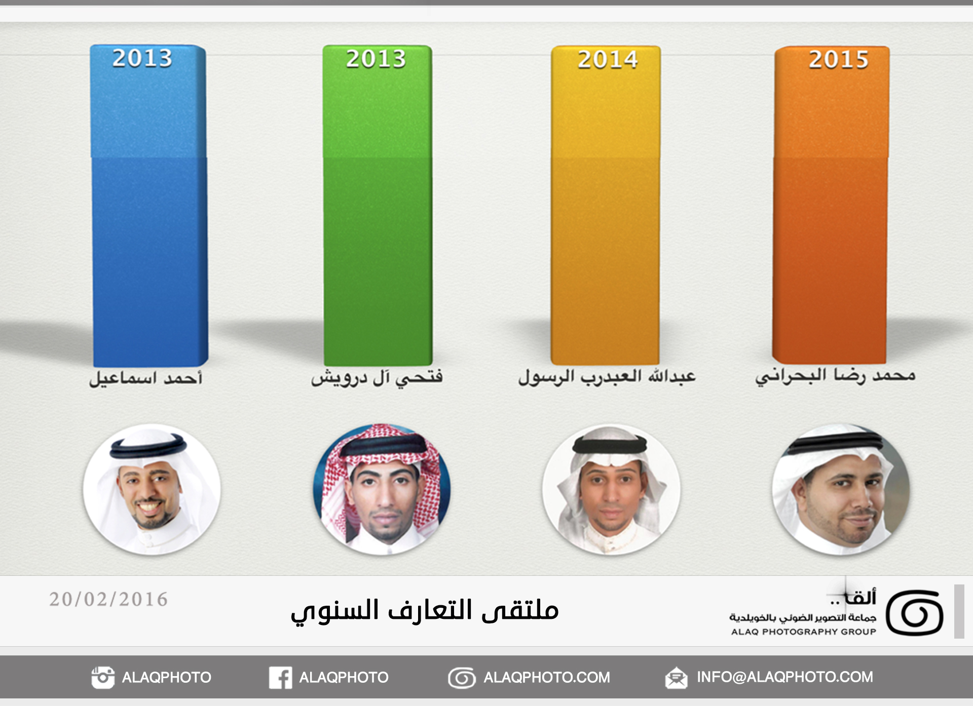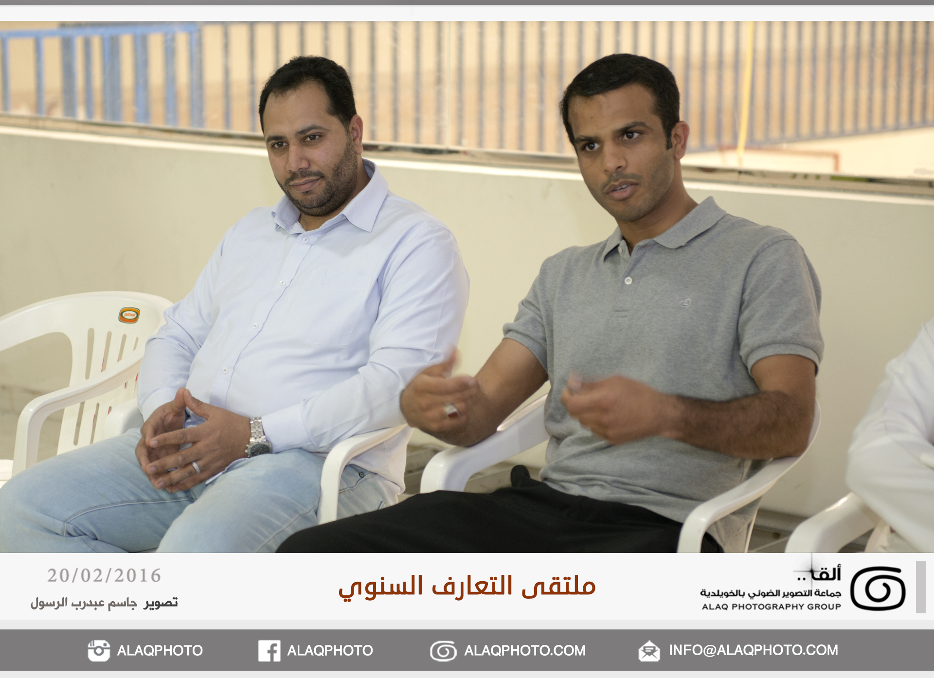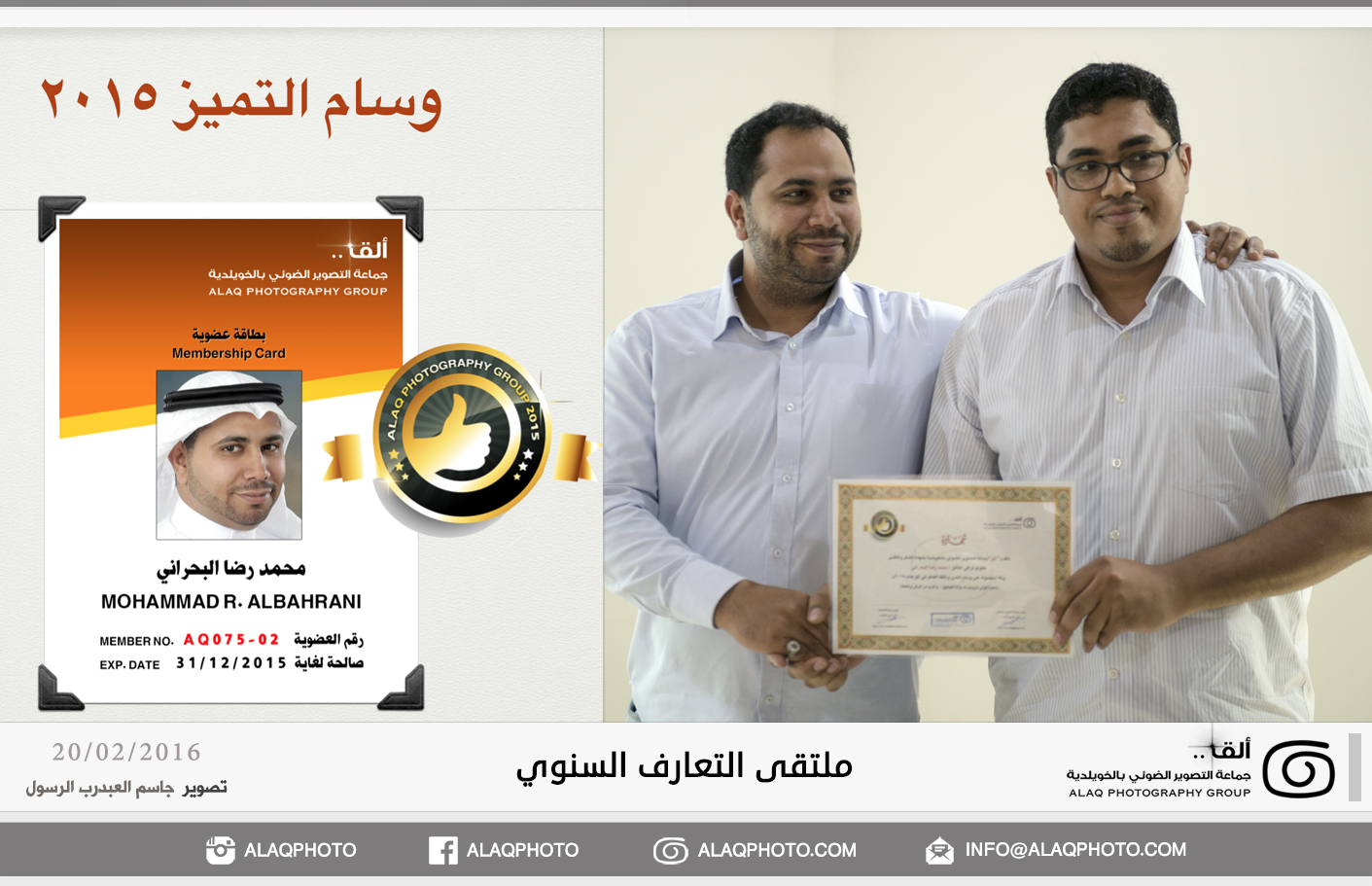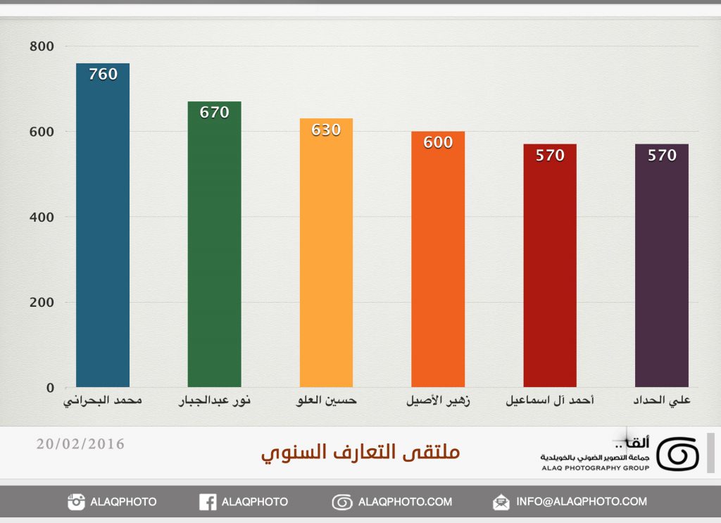 أقامت (ألق) جماعه التصوير الضوئي بالخويلدية ملتقى التعارف السنوي للأعضاء وذلك مساء يوم السبت الموافق 20 فبراير 2016 م في مقر الجماعة بالنادي والذي حضره حوالي ثلاثون عضواً من ألق . وابتدأ اللقاء بجولة تعريفية لكل عضو ، ليعرفعن نفسه واهتماماته بالتصوير الضوئي وكيف التحق بهذه الهواية .
